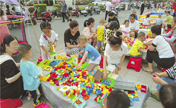 明珠廣場的夜晚更是熱鬧非凡,廣場里一群群男女老少翩翩起舞,跳著各種廣場舞;廣場四周的廊亭上坐滿了休閑納涼的老人和情侶,廣場南邊是臨時組合的兒童樂園,孩子們在那里玩積木、釣魚、玩偶涂色,到處洋溢著孩子們的歡聲笑語。