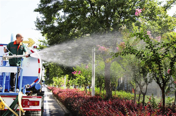 近期持續(xù)晴熱高溫天氣,隨州城區(qū)樹木花草面臨嚴(yán)峻“烤”驗(yàn),出現(xiàn)不同程度旱情。為保護(hù)城市園林綠化生態(tài),市城管執(zhí)法委組織園林綠化部門全力投入抗旱保綠工作。7月以來(lái),該委共投入車輛1200余臺(tái)次,澆水2.6萬(wàn)余噸。圖為8月11日,市綠化管護(hù)中心的工人正在澆水抗旱保綠。(隨州日?qǐng)?bào)通訊員 聶少峰攝)