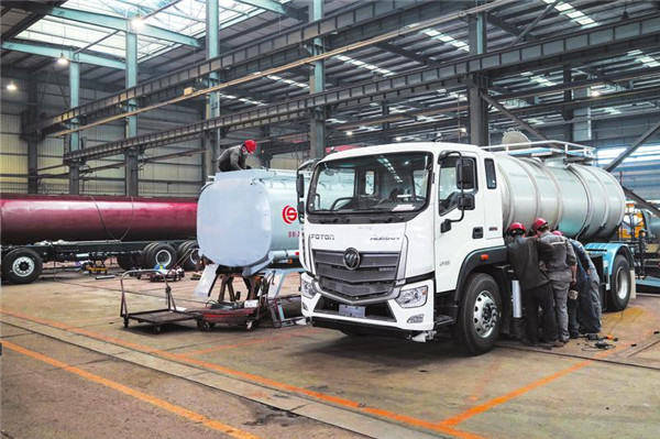 楚勝汽車集團有限公司集專用汽車自主研發(fā)、設(shè)計、制造為一體,擁有雄厚的研發(fā)技術(shù)能力。該公司注重市場需求,新開發(fā)的國六加油車系列受到用戶青睞,成為暢銷車型。圖為公司油罐車生產(chǎn)車間。 (隨州日報全媒記者 孫洪濤攝)