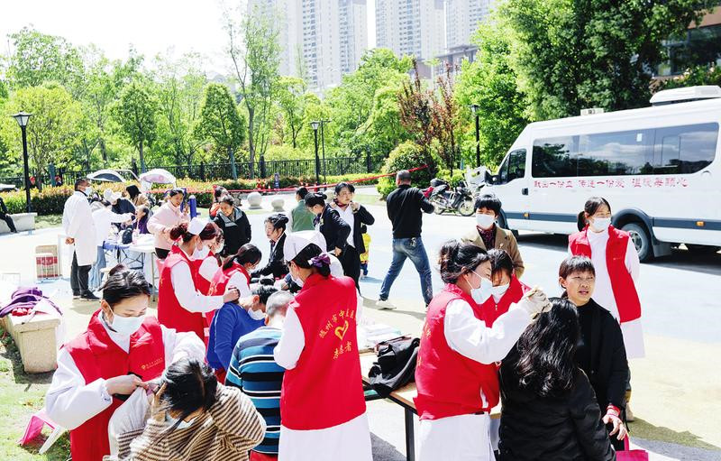 曾都區(qū)涢水街道推動社區(qū)志愿服務(wù)活動常態(tài)化,發(fā)揮志愿服務(wù)在構(gòu)建和諧文明社區(qū)中的積極作用。近日,該街道在涢水社區(qū)舉行“公益集市進社區(qū)”活動,開展家電維修、防詐騙知識宣傳、義診等志愿活動。圖為市中醫(yī)醫(yī)院醫(yī)護人員為涢水社區(qū)居民義診。(隨州日報全媒記者李文軍、通訊員黃江攝)