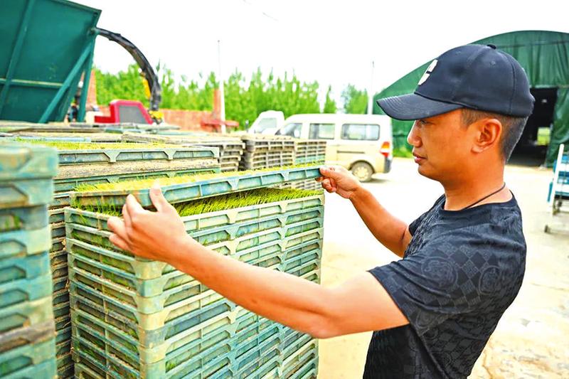 萬(wàn)店鎮(zhèn)槐東村順林合作社負(fù)責(zé)人準(zhǔn)備將培育好的秧苗送到農(nóng)戶