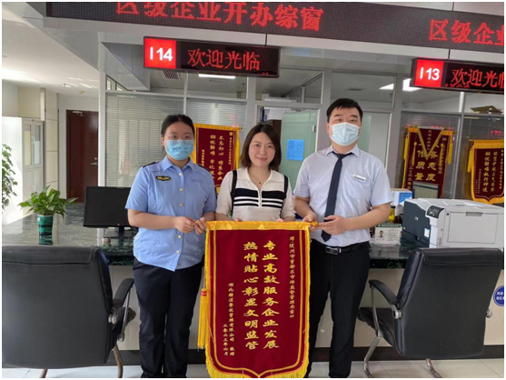 一分耕耘,一分收獲。該局窗口工作人員用專業(yè)、高效、熱情的服務(wù),幫助企業(yè)解決實際困難,贏得了辦事群眾的好評。6月8日,市民宋女士也專程來到區(qū)市場監(jiān)管局窗口為工作人員送上一面“優(yōu)化營商環(huán)境 高效熱情服務(wù)”的錦旗。此前,宋女士曾到該窗口向工作人員尋求幫助。她表示,自己想接手他人的一家網(wǎng)吧,但不知道如何走變更手續(xù)。窗口首席服務(wù)員了解情況后,立即指導(dǎo)宋女士提交變更資料申請,并受理審核。在得知宋女士經(jīng)營范圍還包括食品銷售時,首席服務(wù)員又為宋女士辦理了食品經(jīng)營許可證,二十分鐘后宋女士便拿到了“雙證”。