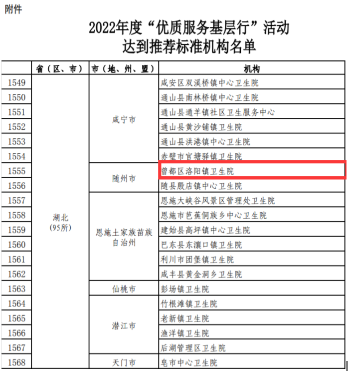 隨州新聞網(wǎng)訊 (通訊員羅楚強、李金柱)近日,國家衛(wèi)生健康委辦公廳、國家中醫(yī)藥局管理局綜合司印發(fā)《關于對2022年度“優(yōu)質(zhì)服務基層行”活動表現(xiàn)突出、服務優(yōu)質(zhì)的機構(gòu)予以通報表揚的通知》,曾都區(qū)洛陽鎮(zhèn)衛(wèi)生院榜上有名。