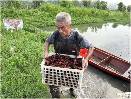 在裕豐稻蝦養(yǎng)殖基地,溝渠環(huán)繞,水光瀲滟。拔節(jié)生長的秧苗間隙,一只只活力十足的龍蝦愜意穿梭。隨著一個個地籠從水田里撈起,鮮活的龍蝦很快便盛滿籮筐!翱茖W(xué)合理的水環(huán)境,是小龍蝦養(yǎng)殖的關(guān)鍵!闭f起龍蝦養(yǎng)殖,賀森林如數(shù)家珍!暗咎餅辇埼r供餌、遮蔭、避害,龍蝦為稻田除草、增肥,稻蝦共作在田間形成了一個完整的綠色生態(tài)閉環(huán),實(shí)現(xiàn)了一田雙收,綠色發(fā)展!