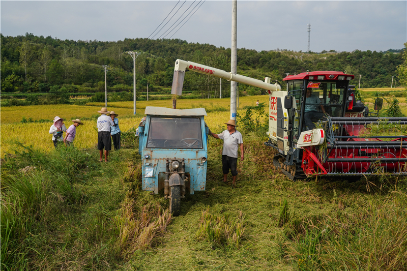 9月7日,曾都區(qū)洛陽鎮(zhèn)君子山村機(jī)聲隆隆,村民們開始收割成熟的水稻。村民們介紹,今年收成非常不錯(cuò),非常開心。(全媒記者 孫洪濤攝)