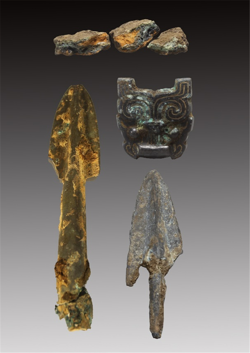 夏家灣遺址考古發(fā)掘的石家河文化早期遺存分布不連續(xù),文化堆積較薄,發(fā)現(xiàn)有灰坑、墻基槽等遺跡,出土有紅陶杯、刻槽盆、擂缽、寬扁形鼎足、磨光黑陶杯柄、藍紋罐、缸等日常生活陶器和石斧、鑿、錛、鏃、陶紡輪等生產(chǎn)用具。發(fā)掘出的西周時期遺存多見灰溝、灰坑和燒面遺跡,出土了大量鬲、豆、罐、甗、盆等陶器殘片和鹿角、豬頜骨、牛牙等動物牙齒或骨骼,以及箭鏃等銅器,還發(fā)現(xiàn)坩堝殘片、銅矛和銅飾件等冶煉遺物。這些冶煉遺物、燒面遺存和銅器,共同揭示了該遺址冶煉鑄銅的功能性質(zhì)。發(fā)掘戰(zhàn)國至秦朝時期豎穴土坑墓數(shù)座,隨葬品中可見銅箭、陶器以及動物骨骼殘存,陶器多為鏊、釜、罐、盆、甑等組合。