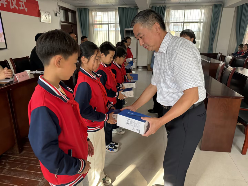 湖北省濕地保護(hù)基金會(huì)秘書長(zhǎng)邱祉軒為淮河鎮(zhèn)小學(xué)贈(zèng)送器材