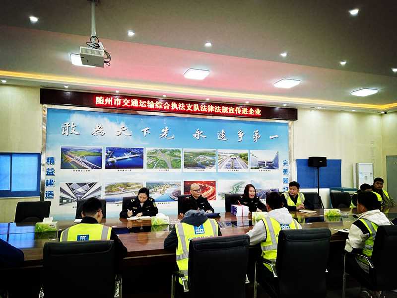 11月10日下午,市交通運(yùn)輸綜合執(zhí)法支隊(duì)五大隊(duì)、六大隊(duì)到隨州南外環(huán)項(xiàng)目部(346國(guó)道十崗至任家臺(tái)段改建工程)開(kāi)展“送交通運(yùn)輸法律法規(guī)進(jìn)企業(yè)”普法宣傳活動(dòng)。