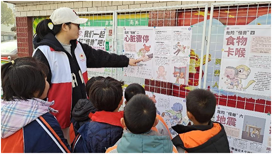 志愿者分年級(jí)組織學(xué)生觀(guān)看海報(bào),并進(jìn)行了詳細(xì)的講解。海報(bào)共8個(gè)板塊,以學(xué)生感興趣的方式,在模擬打怪獸的過(guò)程中將溺水、中暑、燙傷、割傷、癲癇、地震、流鼻血、食物卡喉、交通事故、心臟驟停等急救知識(shí)融入其中,讓學(xué)生在快樂(lè)中學(xué)習(xí),有效的提升了學(xué)生風(fēng)險(xiǎn)識(shí)別和自救互救的能力。