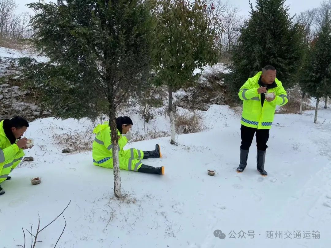 ▲曾都公路工作人員就地坐在雪地上就餐