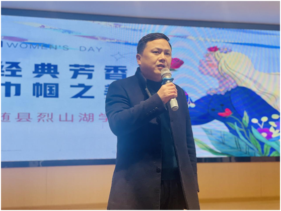 “烈校有佳人,絕世而獨(dú)立。閑時(shí)氣如蘭,幽香送千里。臨水照驚鴻,羞慚自飛起;仨倜纳侨f(wàn)人迷。你們是顏值擔(dān)當(dāng),你們又有才華賦能。進(jìn)課堂,不論春秋,你們愛(ài)心如海。搞管理,無(wú)畏冬夏,你們?nèi)蝿谌卧?.....”烈山湖學(xué)校黨總支書記劉敬東即興賦詩(shī)一首向全體女教職工送上節(jié)日的祝福,贏得陣陣喝彩,將現(xiàn)場(chǎng)氛圍推向高潮。
