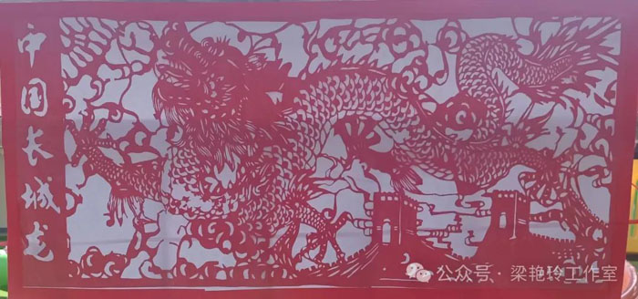 《中國(guó)長(zhǎng)城龍》則運(yùn)用了單剪,陰陽(yáng)結(jié)合的方法表現(xiàn)出龍躍九霄凌云志的夢(mèng)想。