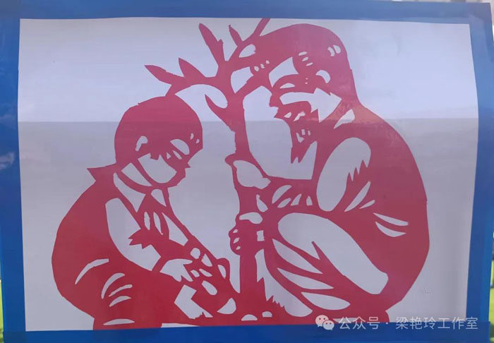 《種樹(shù)》中的爺爺和孫子為給大地增一片綠,種下了一顆小樹(shù)苗,人物運(yùn)用了側(cè)面造型,正好回避了剪紙難以表達(dá)正面造型的局限,人物的動(dòng)態(tài)變化,增強(qiáng)了作品的節(jié)奏感。