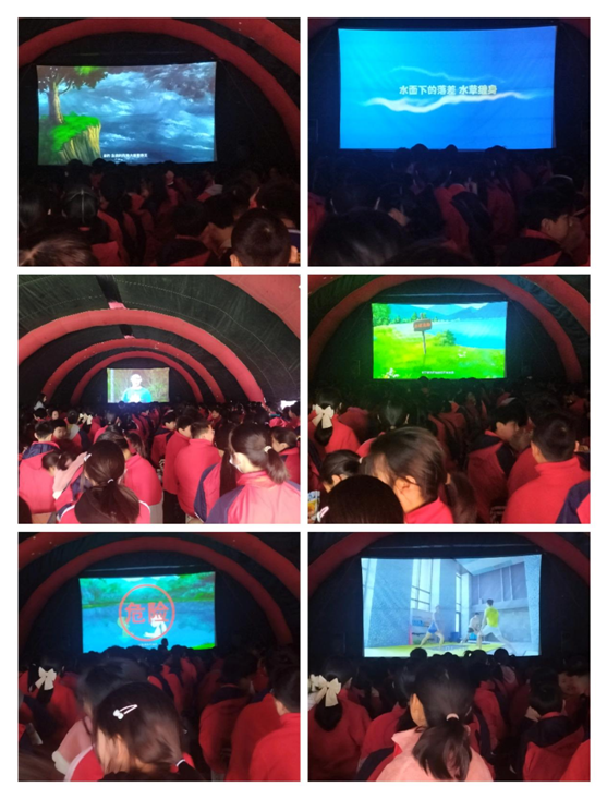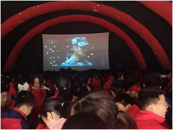 一進校門,孩子們發(fā)現充氣影棚在操場上霸氣地矗立著,他們按捺住滿心的激動,在學校統(tǒng)一指揮下,整齊列隊,有序進入觀影棚。