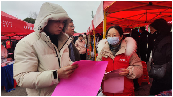 市社保中心工作人員在隨州市2024年春風(fēng)行動活動現(xiàn)場宣傳并為群眾答疑解惑。