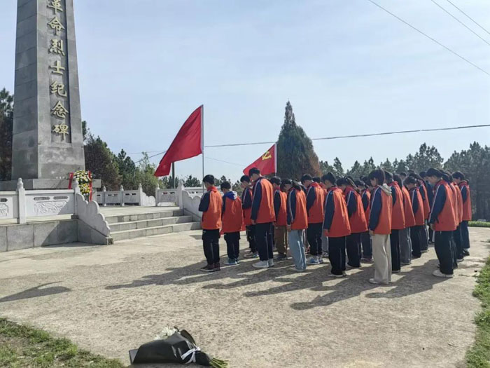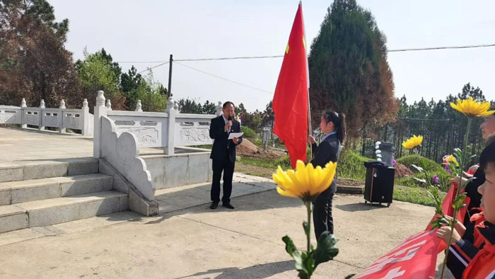 松濤陣陣喚英烈,山崗巍巍埋忠骨。活動(dòng)在低沉的哀樂聲中拉開序幕,全體師生向革命烈士紀(jì)念碑深深鞠躬,表達(dá)對(duì)他們的敬意和懷念。面向鮮艷的五星紅旗,大家共同唱響義勇軍進(jìn)行曲和少年先鋒隊(duì)隊(duì)歌。黨員代表學(xué)校敬獻(xiàn)花籃,學(xué)校校長(zhǎng)段勇上前認(rèn)真整理緞帶。少先隊(duì)員代表肖雅雯動(dòng)情發(fā)言,表達(dá)了對(duì)革命先烈的崇敬之情,體現(xiàn)出新時(shí)代少先隊(duì)員繼承先烈遺志的決心。學(xué)校支部副書記徐敏帶領(lǐng)全體黨員重溫入黨誓詞。學(xué)校少先隊(duì)輔導(dǎo)員馬靜老師帶領(lǐng)呼號(hào)。少先隊(duì)員們也用自己的行動(dòng)做了些力所能及的事情,他們打掃陵園衛(wèi)生,撿拾園內(nèi)垃圾,讓英烈們?cè)谇嗌骄G水間長(zhǎng)眠安息。