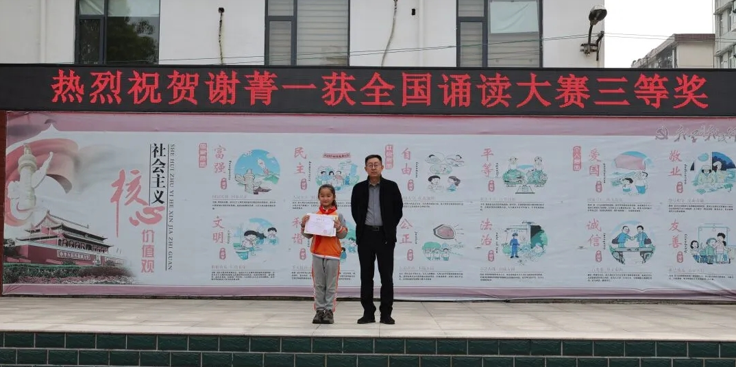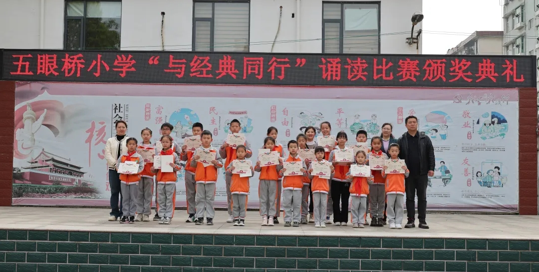在激昂的樂曲聲中,獲獎(jiǎng)學(xué)生依次登臺(tái),從學(xué)校領(lǐng)導(dǎo)手中接過榮譽(yù)證書和獎(jiǎng)杯。他們中有獲得全國(guó)經(jīng)典誦讀三等獎(jiǎng)的同學(xué),有隨州市書法比賽一等獎(jiǎng)的孩子,還有在學(xué)!芭c經(jīng)典同行”誦讀比賽中的獲勝者。