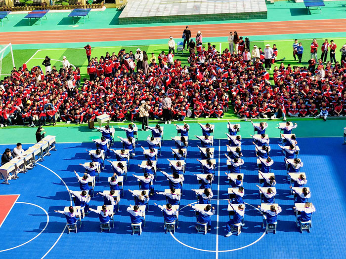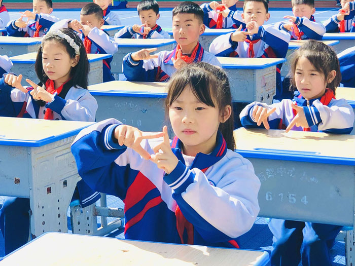 在動感歡快、節(jié)奏鮮明的音樂伴奏下,同學們揮動手臂,以課桌為道具,鼓掌為拍,時而強勁,時而輕柔,音樂在指尖流動,笑容在眉間綻放。現(xiàn)場拍擊聲、鼓掌聲、吟唱聲不絕于耳,在這一刻匯集成一曲激昂的交響樂。