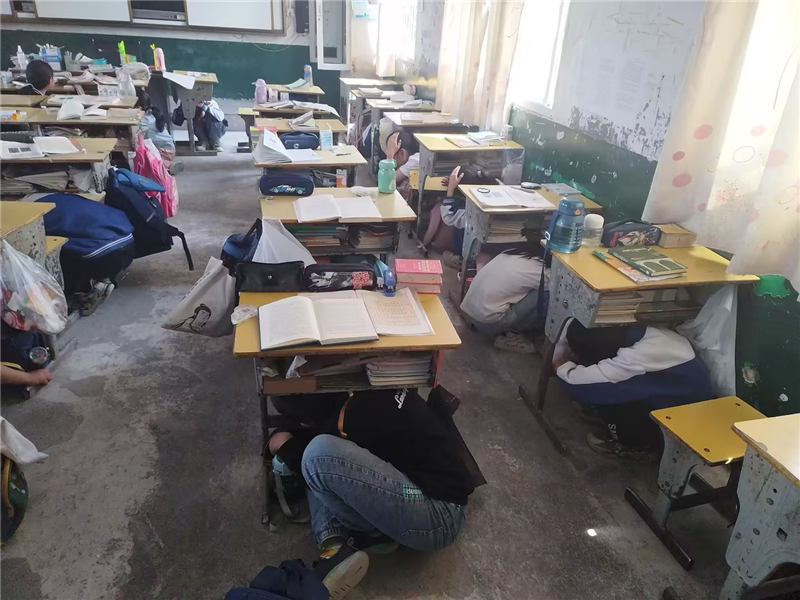 按照學(xué)校應(yīng)急疏散演練的預(yù)案,演練活動(dòng)首先通過廣播發(fā)出第一遍地震預(yù)警信號(hào),各班班主任迅速組織學(xué)生進(jìn)行室內(nèi)抗震避險(xiǎn),并指揮學(xué)生迅速抱頭、躲在桌下,盡量降低身體重心,并盡可能保護(hù)頭部。隨后發(fā)出第二遍地震警報(bào)信號(hào),全校教職工及時(shí)到達(dá)自己所在的指定位置,在教學(xué)樓內(nèi)引導(dǎo)學(xué)生彎腰護(hù)頭快速穿過樓道,有序撤離到操場(chǎng)指定地點(diǎn)。整個(gè)過程學(xué)生能夠按照要求保護(hù)自己的頭部,沿著預(yù)案中的路線向指定地點(diǎn)快速前進(jìn),有序撤離到安全地帶。