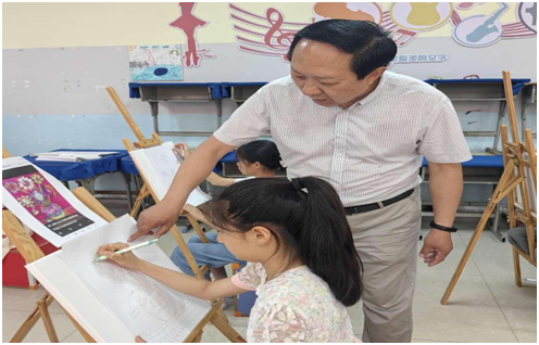 在79屆學(xué)子中,湖北省畫家黃大軍等學(xué)子,走進(jìn)學(xué)!扮姽庳懶M廨o導(dǎo)站”,被孩子們作畫的場景吸引。黃大軍饒有興致的現(xiàn)場為孩子們進(jìn)行繪畫指導(dǎo),通過講解、示范等方法,教授同學(xué)們比例分配、線條表現(xiàn)力、色彩搭配等作畫技巧。