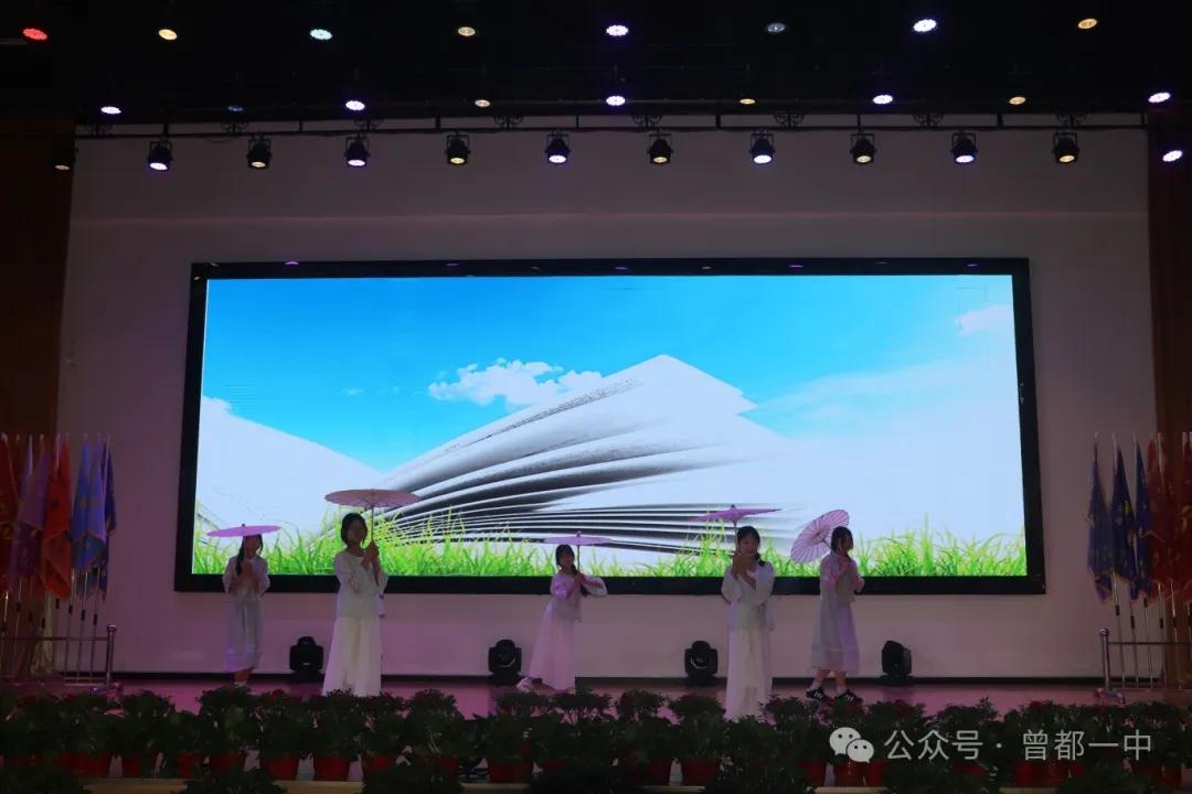 一年級的劉姿軒、陳非凡、高奧涵、祁冠瑜、王寶姿等同學(xué)表演了一段詩意滿滿、靈氣飄飄的傘舞《送別》,猶如水滴般細(xì)膩地表達(dá)對高三師哥師姐們深深的祈福和祝愿。