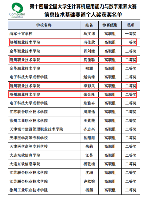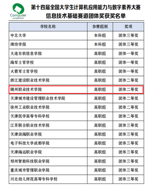 隨州新聞網(wǎng)訊 (通訊員代興梅)5月11日,第十四屆全國大學生計算機應用能力與數(shù)字素養(yǎng)大賽——信息技術基礎賽道舉行,隨州職業(yè)技術學院獲得團體二等獎,學生個人一等獎一項,個人二等獎三項的成績。