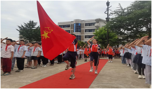 在入隊示范儀式上,厲山鎮(zhèn)中心小學一年級的61名同學整齊列隊,在800多名老隊員的見證下,迎來神圣莊嚴的入隊時刻。儀式在鏗鏘的《出旗曲》中拉開帷幕,隊員們精神飽滿高唱隊歌,整個儀式嚴格按照中國少年先鋒隊入隊儀式儀程規(guī)范執(zhí)行,出隊旗、奏唱隊歌、宣布組建一年級少先隊組織、宣布新隊員名單、為新隊員授紅領(lǐng)巾、新隊員宣誓、為新建中隊授中隊旗、聘請中隊輔導員、向新隊員提出希望和要求、呼號、退旗整個流程環(huán)環(huán)相扣。