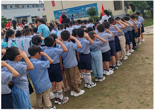 升旗儀式上,當(dāng)看到莊嚴(yán)的五星紅旗冉冉升起時,孩子們變得異常安靜與認(rèn)真,非常投入,全體學(xué)生唱國歌、行隊禮。孩子們被這莊嚴(yán)的氛圍渲染了,也紛紛安靜的向國旗舉手敬禮。