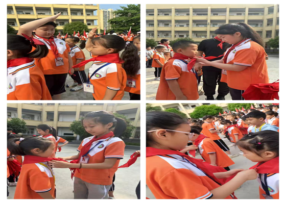 莊嚴(yán)的出旗曲樂聲響起,嘹亮的歌聲再次響徹校園,這是獨(dú)屬于中國少年先鋒隊(duì)隊(duì)員們的歌曲。歌聲中,各中隊(duì)輔導(dǎo)員老師和優(yōu)秀少先隊(duì)員代表們鄭重地為新隊(duì)員系上了鮮艷的紅領(lǐng)巾,用隊(duì)禮表達(dá)自己對新隊(duì)員的祝賀,新隊(duì)員們目光堅(jiān)毅,迅速還禮,表達(dá)感謝之意。這既是授紅領(lǐng)巾,也是一種中國少年先鋒隊(duì)意志的傳承。