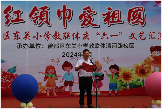 區(qū)清河路小學(xué)黨支部書記、校長(zhǎng)諶江波致歡迎辭。他首先對(duì)東關(guān)小學(xué)教聯(lián)體兄弟學(xué)校的各位領(lǐng)導(dǎo)、老師和同學(xué)參加“六一”盛會(huì)表示熱烈的歡迎,代表學(xué)校向全體同學(xué)致以誠(chéng)摯的節(jié)日問(wèn)候,祝同學(xué)們學(xué)習(xí)進(jìn)步、節(jié)日愉快!向嘔心瀝血、辛勤耕耘的老師們真誠(chéng)的道一聲:“老師,您辛苦了!”。簡(jiǎn)單介紹學(xué)校辦學(xué)思路及近幾年取得的成績(jī),對(duì)全體清河路學(xué)子提出殷切期望。要珍惜今天來(lái)之不易的美好生活,營(yíng)造良好的學(xué)習(xí)環(huán)境,從小踐行社會(huì)主義核心價(jià)值觀,努力爭(zhēng)做新時(shí)代優(yōu)秀的社會(huì)主義事業(yè)建設(shè)者和接班人。