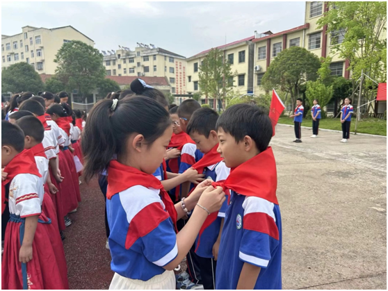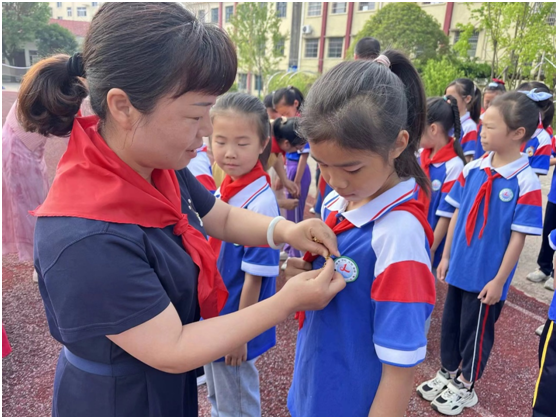 在莊嚴(yán)的國旗下,少先隊(duì)大隊(duì)輔導(dǎo)員黃銀老師宣讀新隊(duì)員名單。隨后,高年級(jí)優(yōu)秀隊(duì)員為新隊(duì)員佩戴紅領(lǐng)巾,新隊(duì)員們用稚嫩而堅(jiān)定的聲音,在隊(duì)旗下莊嚴(yán)宣誓,表達(dá)了他們?yōu)楣伯a(chǎn)主義事業(yè)而奮斗的決心。