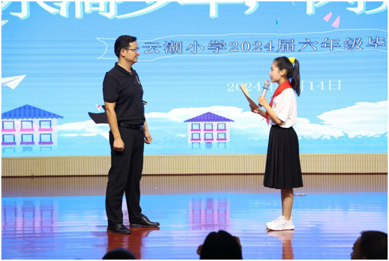 白云湖小學副校長謝建鄂的精彩致辭,表達對畢業(yè)生誠摯祝愿的同時,還提出了殷切希望,讓全體畢業(yè)生始終保持對學習的熱愛,對生活的熱情,勇敢地去追求自己的夢想,母校將永遠是他們的堅強后盾。