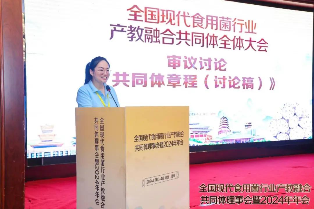 隨州市人民政府副市長羅蘭首先發(fā)表致辭,她提到,希望全體成員能充分發(fā)揮共同體功效,齊心協(xié)力推進(jìn)教育與產(chǎn)業(yè)深度融合,奮力譜寫創(chuàng)新人才培養(yǎng)與高等教育高質(zhì)量發(fā)展的新篇章。她表示,隨州市政府將持續(xù)大力支持食用菌產(chǎn)業(yè)的發(fā)展,通過創(chuàng)建多形式基地,借助各類產(chǎn)學(xué)研平臺,以科技創(chuàng)新推動產(chǎn)業(yè)創(chuàng)新,發(fā)展新質(zhì)生產(chǎn)力,用加快隨縣香菇智慧交易城建設(shè)、豐富供應(yīng)鏈金融產(chǎn)品供給等一系列舉措,為全國現(xiàn)代食用菌行業(yè)產(chǎn)教融合共同體的建設(shè)提供堅實有力保障。