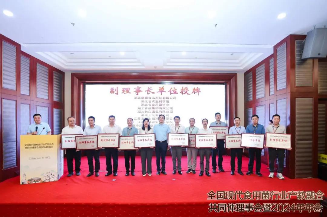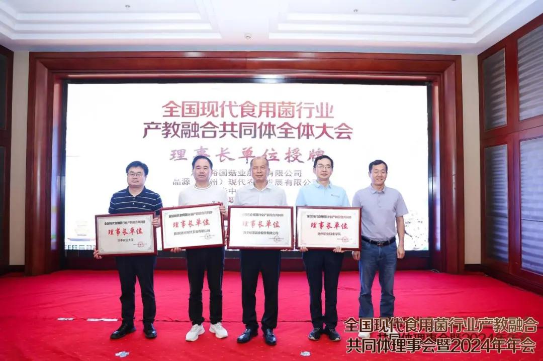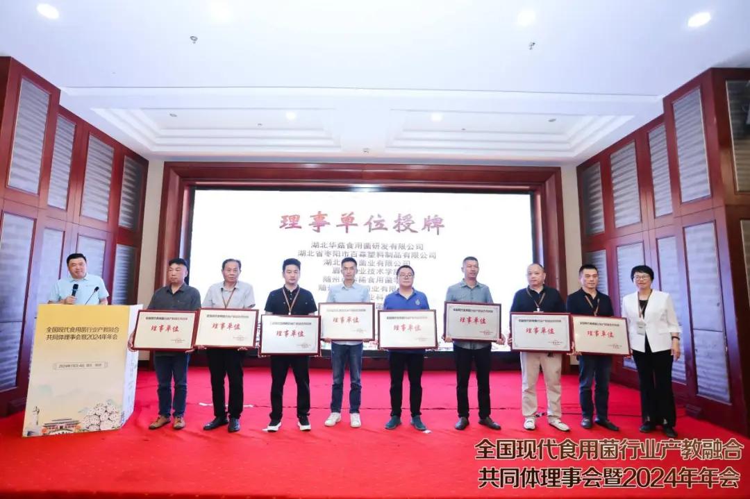 開幕式結(jié)束后,隨即開始了全國現(xiàn)代食用菌產(chǎn)業(yè)產(chǎn)教融合共同體全體大會。首先由隨州職業(yè)技術(shù)學(xué)院香菇學(xué)院黨支部書記吳冉冉宣讀《共同體章程(討論稿)》,討論稿以舉手表決的形式審議通過。然后以舉手表決的形式通過了理事長單位名單、副理事長單位名單、理事單位名單,并現(xiàn)場進(jìn)行了授牌。大會通過湖北裕國菇業(yè)股份有限公司、品源(隨州)現(xiàn)代農(nóng)業(yè)發(fā)展有限公司、華中農(nóng)業(yè)大學(xué)、隨州職業(yè)技術(shù)學(xué)院共4家理事長單位,通過包括易菇網(wǎng)在內(nèi)的12家副理事長單位,16家理事單位。此外還有多家會員單位,會員單位可作為理事單位候選,申請理事單位,于下屆理事會時進(jìn)行審議。