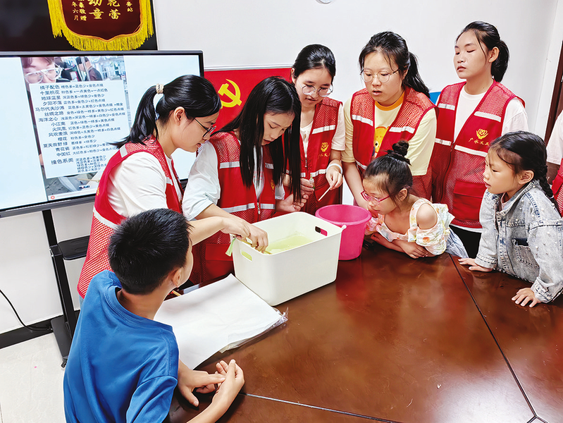 “不只納涼,漆扇以扇子為載體,運(yùn)用漆器工藝精心制作而成,使用漆藝中的‘漂漆’技法,利用漆不溶于水的特質(zhì),將扇子放入水中接觸染料,形成妙趣橫生、自然天成的圖案,給人帶來清風(fēng)拂面的舒適感受……”大學(xué)生志愿者向孩子們介紹什么是漆扇、漆扇的歷史淵源、制作工藝和傳承價(jià)值,讓孩子們了解漆扇,感受手工藝術(shù)的美好。