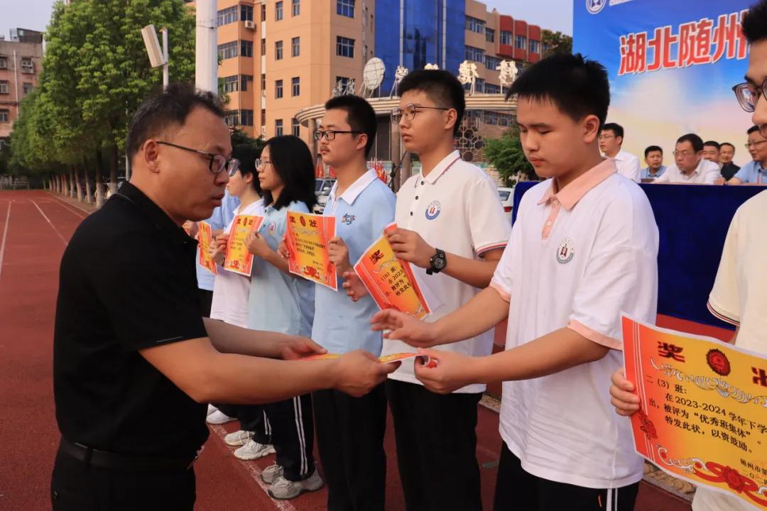 校黨委委員、紀(jì)委書記金峰、副校長邱武分別宣讀“犇星”獎(jiǎng)學(xué)金和“優(yōu)秀班集體、優(yōu)秀學(xué)生干部、三好學(xué)生、優(yōu)秀特長生”的表彰通報(bào),隨州二中校黨委書記馬立學(xué)、黨委副書記、校長肖繁榮給學(xué)生頒獎(jiǎng)并發(fā)放獎(jiǎng)學(xué)金。