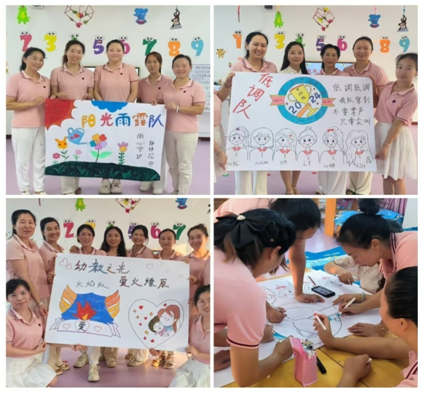 老師們以年級(jí)組為單位組成團(tuán)隊(duì),迅速發(fā)揮想象和創(chuàng)意,制作團(tuán)隊(duì)海報(bào),確定團(tuán)隊(duì)口號(hào),一幅幅精美的海報(bào)就新鮮出爐了。大班組的老師們準(zhǔn)備了精彩的表演,優(yōu)美的歌聲,靈動(dòng)的舞姿,帶給大家視聽享受。 激動(dòng)人心的套圈游戲開始了,大家積極參與,斗智斗勇,歡笑聲回響在整個(gè)活動(dòng)場(chǎng)地;顒(dòng)最后,全體教師還進(jìn)行了集體朗誦《一起守護(hù)》。