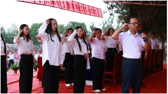 開(kāi)學(xué)典禮在莊嚴(yán)的國(guó)歌聲中拉開(kāi)序幕,全體師生面向國(guó)旗肅然而立,懷著崇高的敬意注視著冉冉升起的國(guó)旗,心中燃起對(duì)新學(xué)期的美好憧憬。隨后,7位新入職教師在校黨委書(shū)記吳波帶領(lǐng)下,和全體教職工在國(guó)旗下莊嚴(yán)宣誓,錚錚誓言體現(xiàn)了教師們對(duì)教育事業(yè)的忠誠(chéng)與熱愛(ài),以及肩負(fù)起培育祖國(guó)未來(lái)?xiàng)澚旱氖姑c擔(dān)當(dāng)!