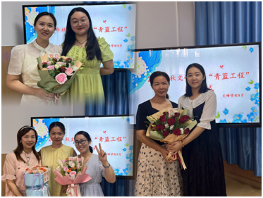 會議第二項,由主持人張桔莉老師宣布青藍工程結(jié)對名單;由校長劉浩、副校長沈俊俊為輔導(dǎo)教師頒發(fā)證書;徒弟為師傅獻上鮮花并以熱烈的懷抱迎接師傅。
