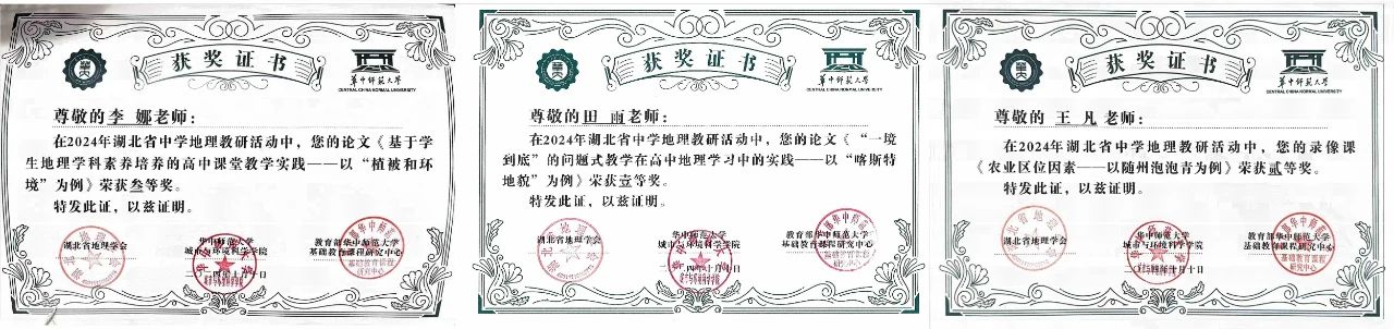 研討會召開前夕,湖北省地理學(xué)會面向湖北省各市(州)地理教研員、中學(xué)一線地理教師,師范院校地理教育研究者及本科生、研究生等相關(guān)人員征集優(yōu)質(zhì)課堂教學(xué)作品以及教研論文并展開了評選。學(xué)校地理教研組積極鼓勵青年教師參加,并在本次評選活動中取得了較好的成績:田雨老師的論文《“一境到底”的問題式教學(xué)在高中地理學(xué)習(xí)中的實踐——以“喀斯特地貌”為例》在論文評選中榮獲一等獎,王凡老師的優(yōu)質(zhì)課《農(nóng)業(yè)區(qū)位因素——以隨州泡泡青為例》在優(yōu)質(zhì)課評選中榮獲二等獎,李娜老師的論文《基于學(xué)生地理學(xué)科素養(yǎng)培養(yǎng)的高中課堂教學(xué)實踐——以“植被和環(huán)境”為例》在論文評選中榮獲三等獎。