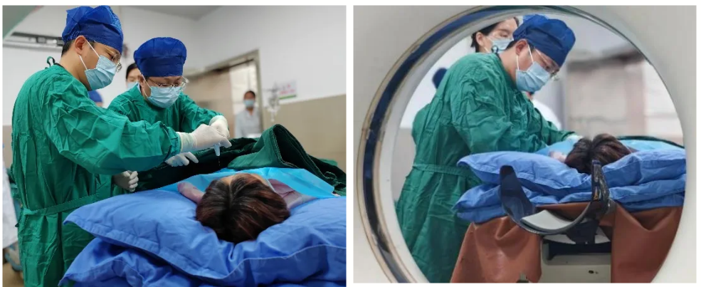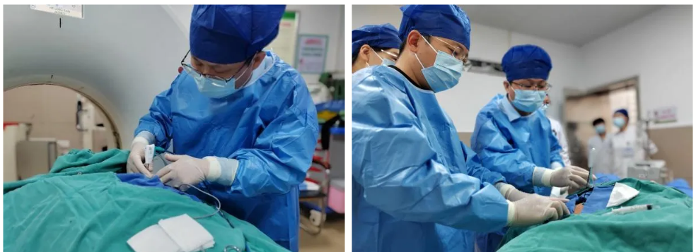 呼吸與危重癥醫(yī)學(xué)科三病區(qū)副主任醫(yī)師謝燦果、主管醫(yī)師李金林與患者及家屬溝通后,患者選擇經(jīng)皮微創(chuàng)手術(shù)——肺部腫瘤微波消融術(shù)。隨即完善術(shù)前準(zhǔn)備,局麻后在CT引導(dǎo)下將微波穿刺針穿透腫瘤,經(jīng)過低功率2個(gè)循環(huán)的微波消融治療,消融灶完全覆蓋腫瘤,以期達(dá)到近似外科手術(shù)的根治性治療效果。