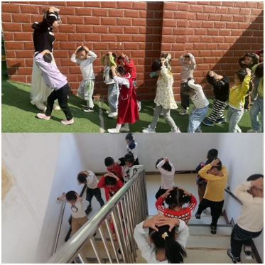 演練開始前,佘老師通過看圖片、聽故事、做示范等方式對幼兒進行了防踩踏安全知識教育,幫助幼兒理解發(fā)生踩踏事故的主要原因,學會緊急事件發(fā)生后的安全避險方法。