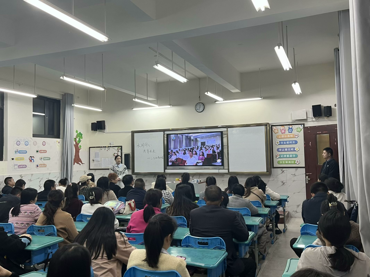 接著,各班班主任立足班級實情,全面介紹了開學以來的班級情況,包括學生的學習狀態(tài)、行為習慣以及班級氛圍等,明確了家長日常需要完成的事務(wù)。同時,以“九雅”文化為依托向家長介紹對孩子文明習慣的養(yǎng)成教育,指導家長正確的教育方法。