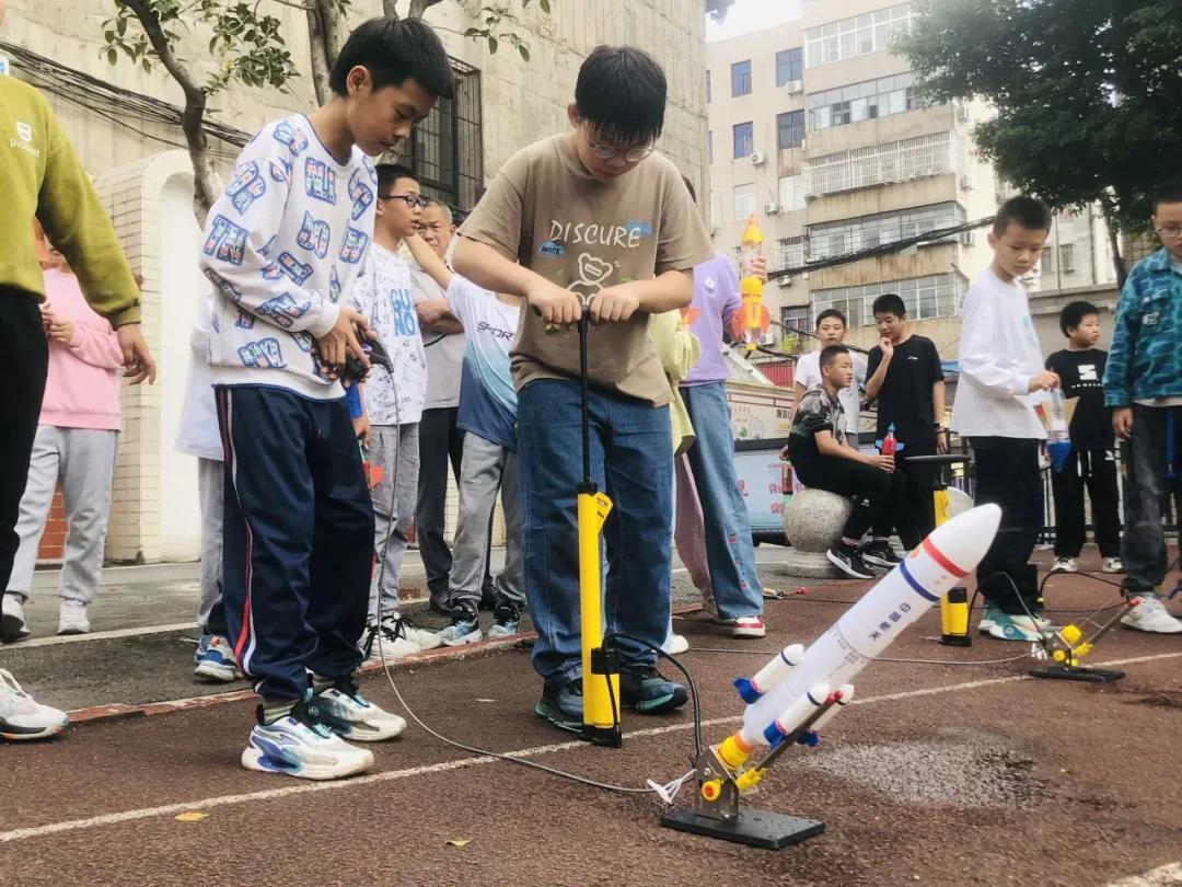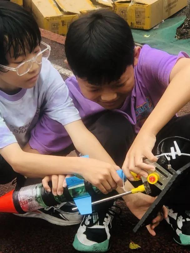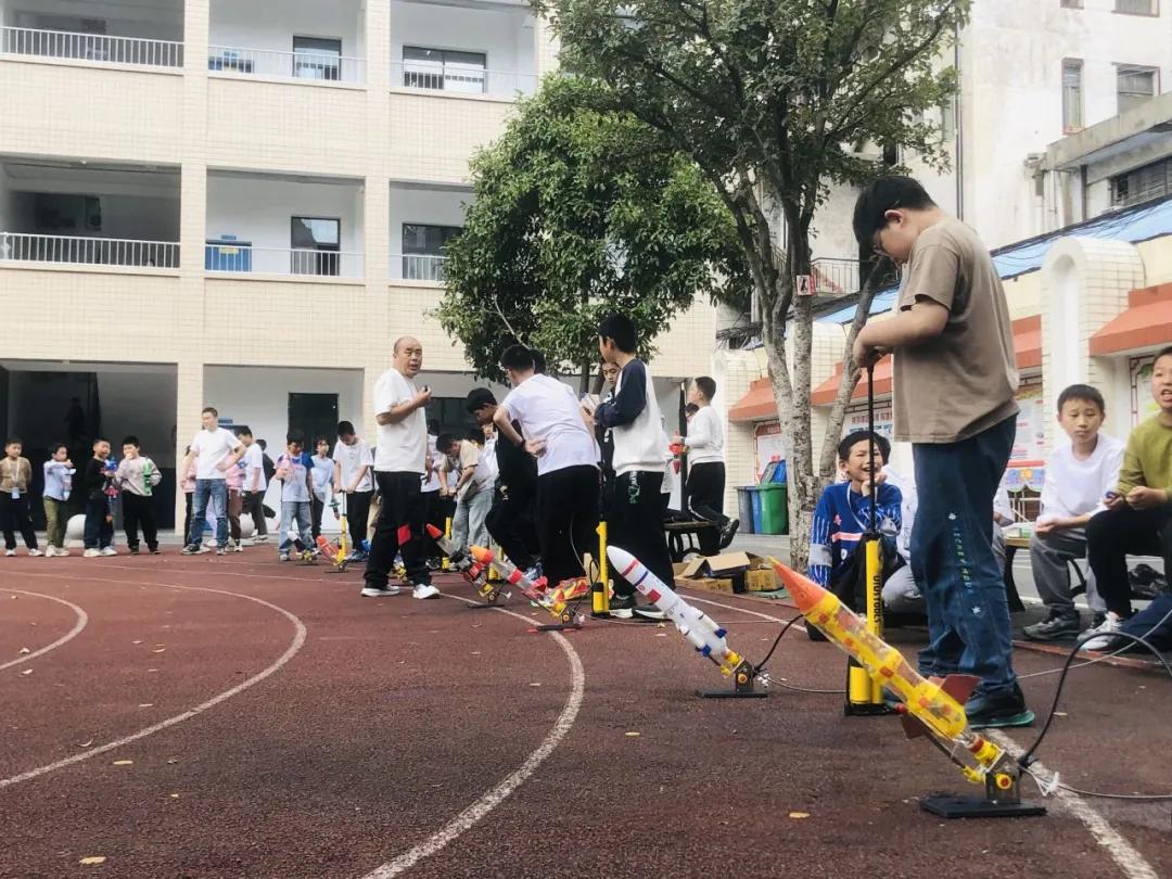 最后進(jìn)行的“水火箭射遠(yuǎn)“比賽,活動(dòng)吸引了全校師生的目光。同學(xué)們利用簡(jiǎn)單的物理原理,親手制作出水火箭,并在操場(chǎng)上進(jìn)行了發(fā)射。隨著一聲聲清脆的哨響,水火箭騰空而起,劃出一道道美麗的弧線。水火箭射遠(yuǎn)比賽展現(xiàn)了同學(xué)們對(duì)科學(xué)原理的深刻理解,更激發(fā)了他們對(duì)航天科技的無(wú)限向往。