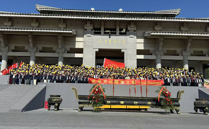 在基地導(dǎo)師的帶領(lǐng)下,全體師生步行至圣象廣場舉行開營儀式,途徑文化雕塑壁,照壁,四牛耕作石雕,華夏始祖門,圣火臺,炎帝圣像等,并在圣像廣場進(jìn)行學(xué)生版的“拜祖大典”。