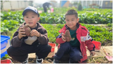 種植園里,孩子們有的用鋤頭,有的用鏟子,還有的小朋友圍在一起用手拔,紅薯地里傳來一陣陣歡聲笑語,大家都沉浸在勞動(dòng)的快樂之中。