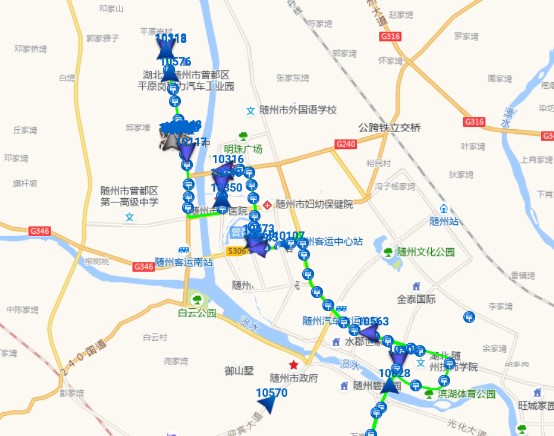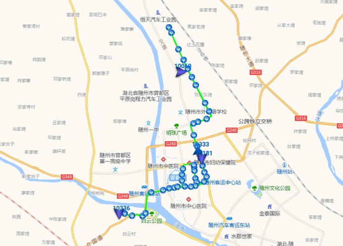 上行(府河化工廠→湖北潤力專汽)方向:府河化工廠→張家灣→金三角→白云公園→二建公司→水務(wù)集團→水西門→小十字街→大十字街→購物中心→客運中心站→澳門街口南→澳門街口→農(nóng)行小區(qū)→交警一大隊→東風(fēng)專汽→清河路口南→清河路口→明珠東路(吾悅廣場)→明珠東路東站→孔家坡小區(qū)→區(qū)城投公司→曾都二中→圓夢星光城東→周家寨→星光五組→星光一路路口→太山廟一組→謝家寨→湖北潤力專汽