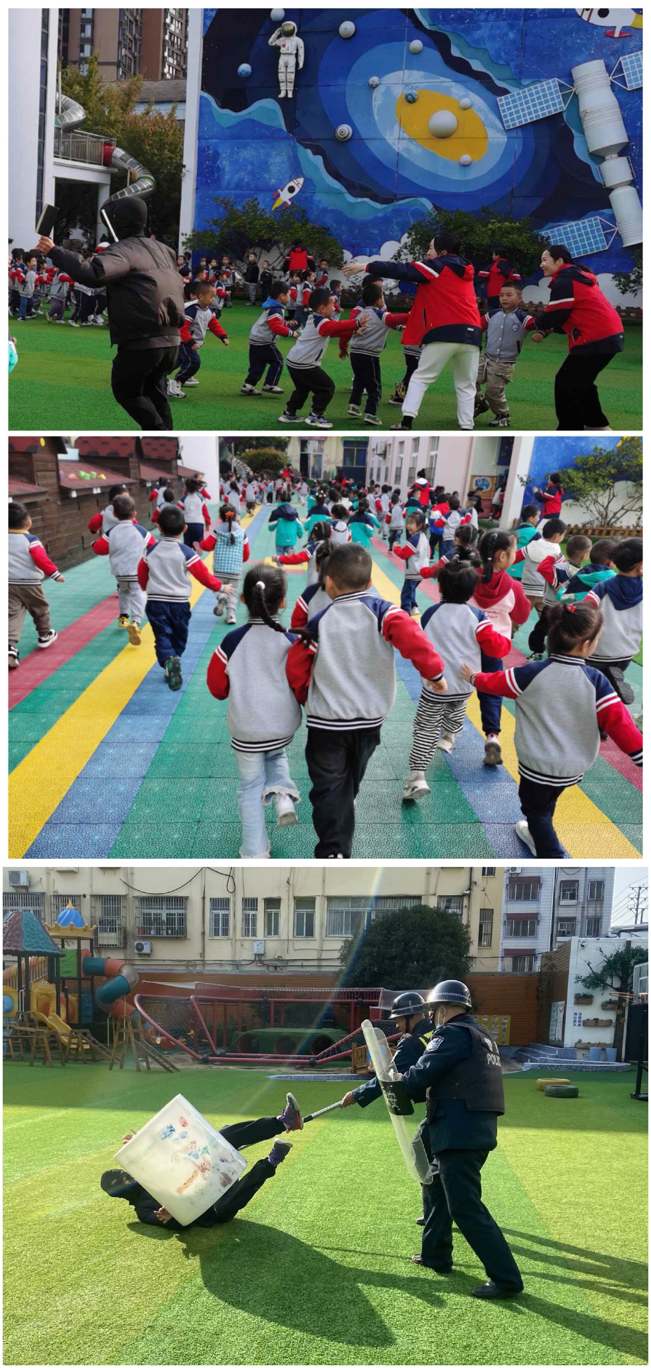 上午九點(diǎn)半,各班在操場(chǎng)有序進(jìn)行早操活動(dòng)。一名“歹徒”在幼兒園門口徘徊,當(dāng)保安盤問時(shí)突然不顧阻擋沖進(jìn)操場(chǎng)。緊急時(shí)刻,保安第一時(shí)間按下一鍵報(bào)警,并拿起警棍、鋼叉等器械沖向歹徒進(jìn)行圍堵攔截。當(dāng)急促的警報(bào)聲響起,園內(nèi)各人員迅速根據(jù)預(yù)案分工各司其職,各班教師帶領(lǐng)幼兒按照預(yù)定路線快速疏散,尋找隱蔽的位置躲避,保安和后勤相關(guān)人員合力將“歹徒”制服。警報(bào)解除后,各班教師立即清點(diǎn)人數(shù),并對(duì)幼兒進(jìn)行心理疏導(dǎo),消除幼兒對(duì)演練活動(dòng)的恐懼。