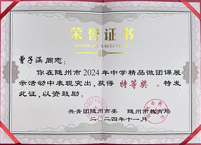 曾都區(qū)實驗初級中學(xué)在隨州市2024年中學(xué)精品微團課比賽中榮獲特等獎
