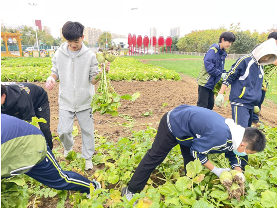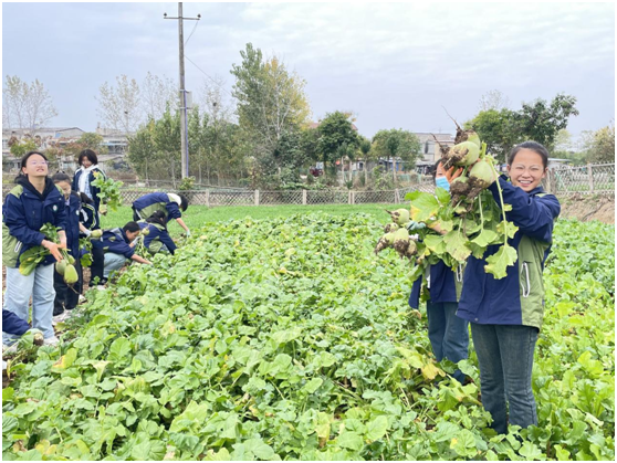 瓦藍的天空,碧綠的菜畦,嫩綠的蘿卜葉子在微風中輕輕搖曳。五豐學校九年級學生在老師的帶領下,滿懷期待地來到“五谷豐登園”;顒娱_始前,老師認真講解拔蘿卜的技巧和注意事項,將勞動教育的理念巧妙融入其中。
